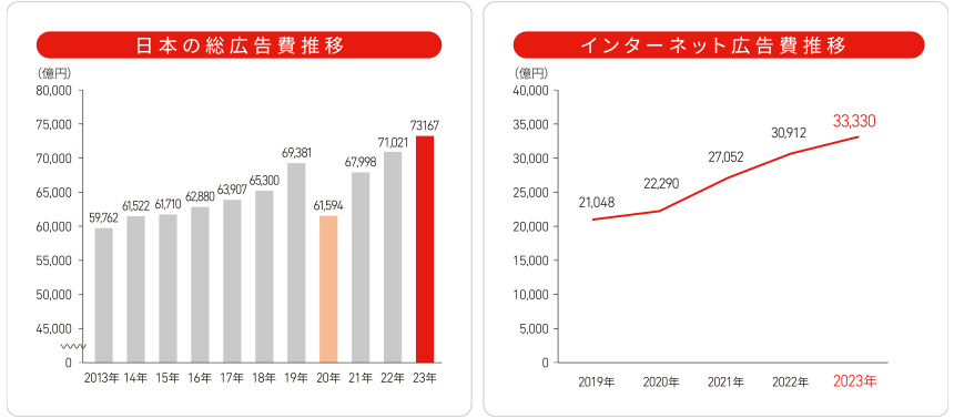 かつて広告の主役だったテレビは、今やその座をネットに譲りつつあります。「2024年広告費予測」によると、テレビ広告 は微減傾向にある一方で、デジタル広告費は大幅な成長を続けています。特に、スマートフォンやSNSを活用した動画広告 が急速に普及し、インターネットが新たな情報発信の中心となっています。