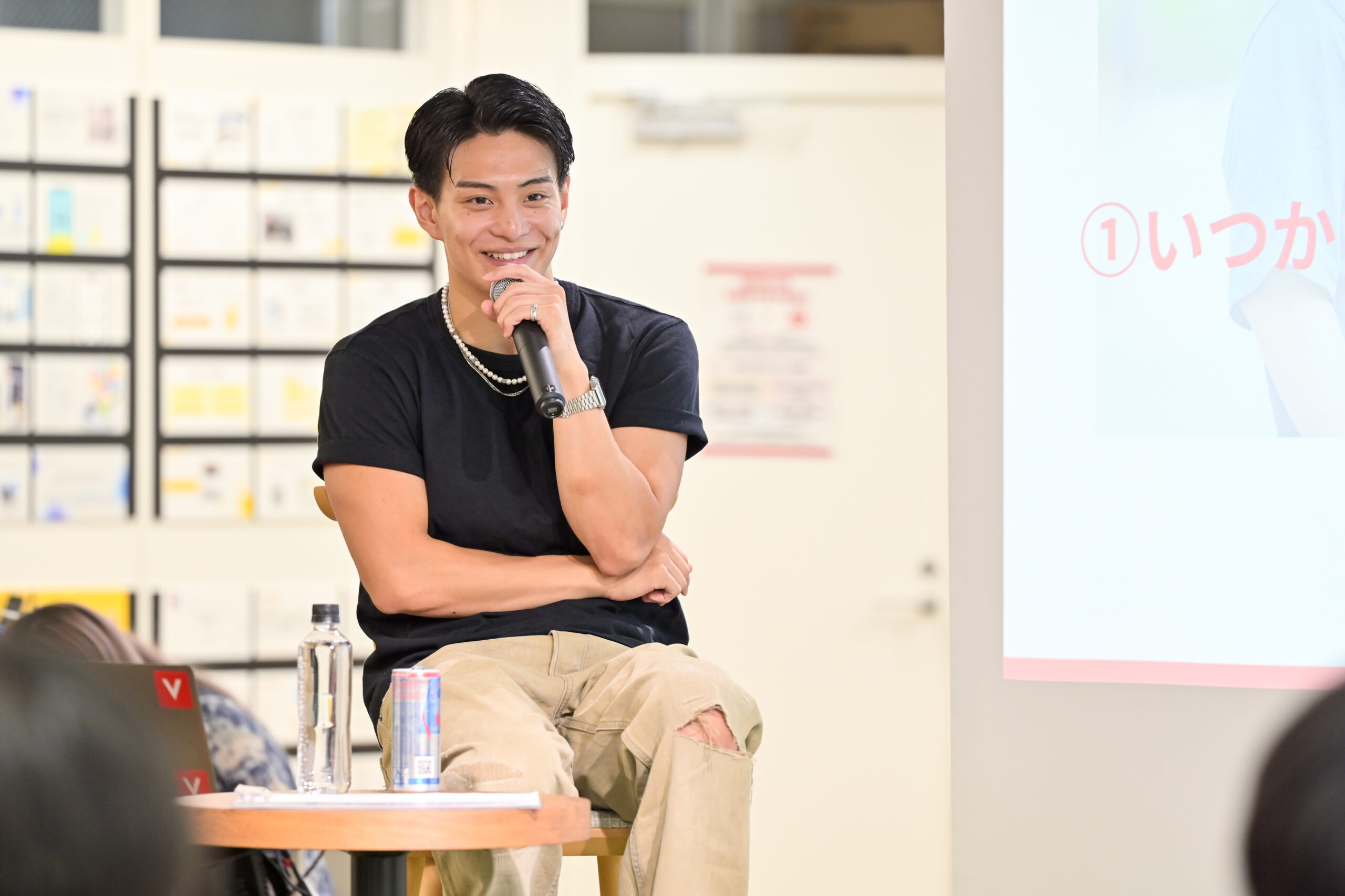 今回の講師は、『キミとオオカミくんには騙されない』や『放課後アオハル学園』に出演!「カマキリダンス」でバズを起こした卒業生・たいりさん(たいり / Tairi (@tairi46) | TikTok)。また、バンタンクリエイターアカデミーオフィシャルVTuber・白撮イヴ(17歳)さんも在校生代表として登壇します!大きな拍手に包まれて、たいりさんが登場。インタビュアーによる質問形式で進行します!