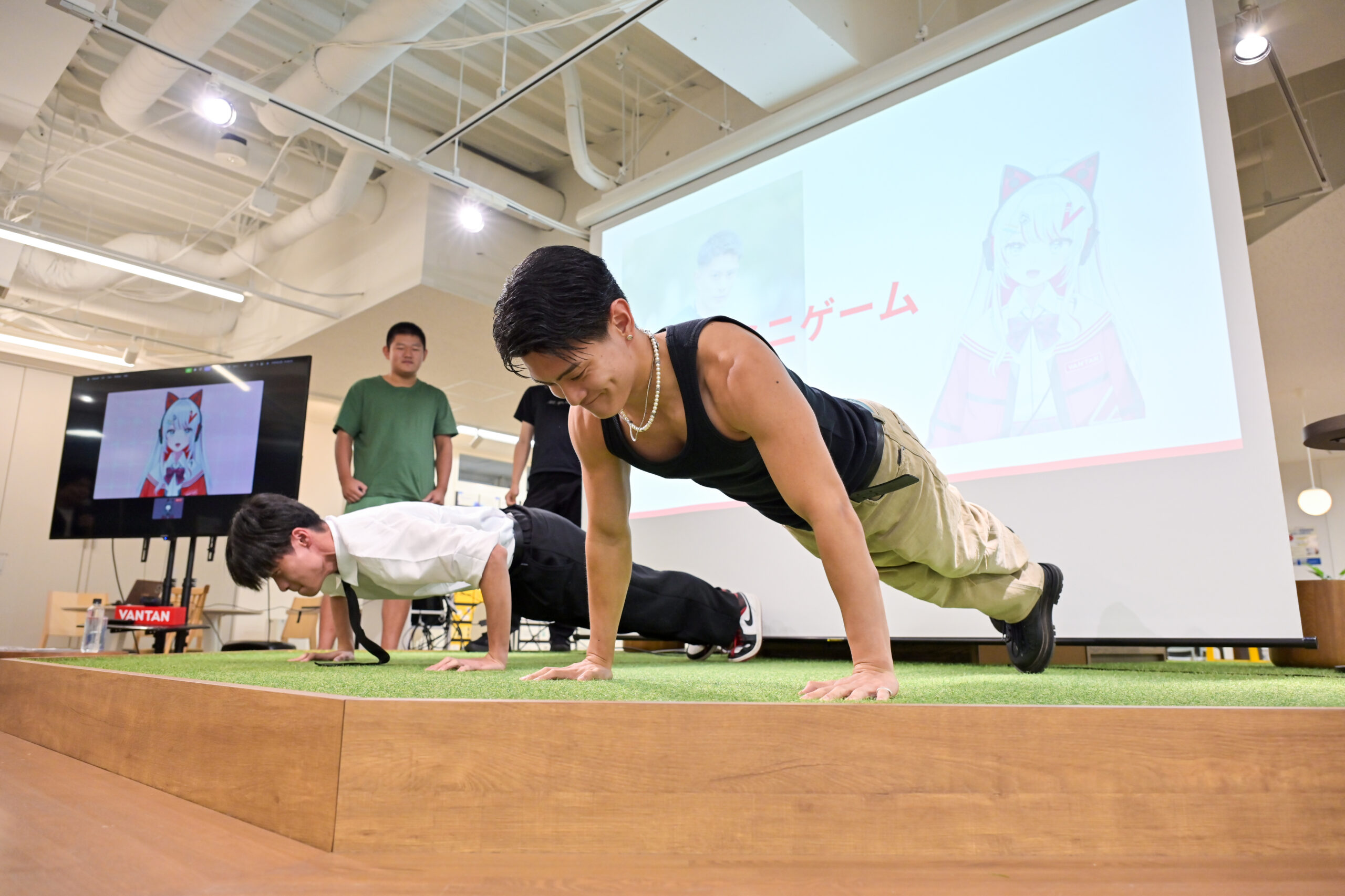 まずは、腕立て対決!ただ対決しても面白くないので!たいりさんは1人で40回、在校生メンバーは3人で40回到達を目指します!1、2、3、4、5…と最初は順調でしたが、ドンドン差が開いていくたいりさんとメンバー。